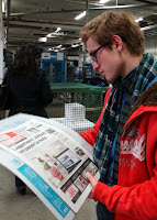 | Mon fils Nathan admire son exemplaire tout frais du Sud Ouest du lendemain. |