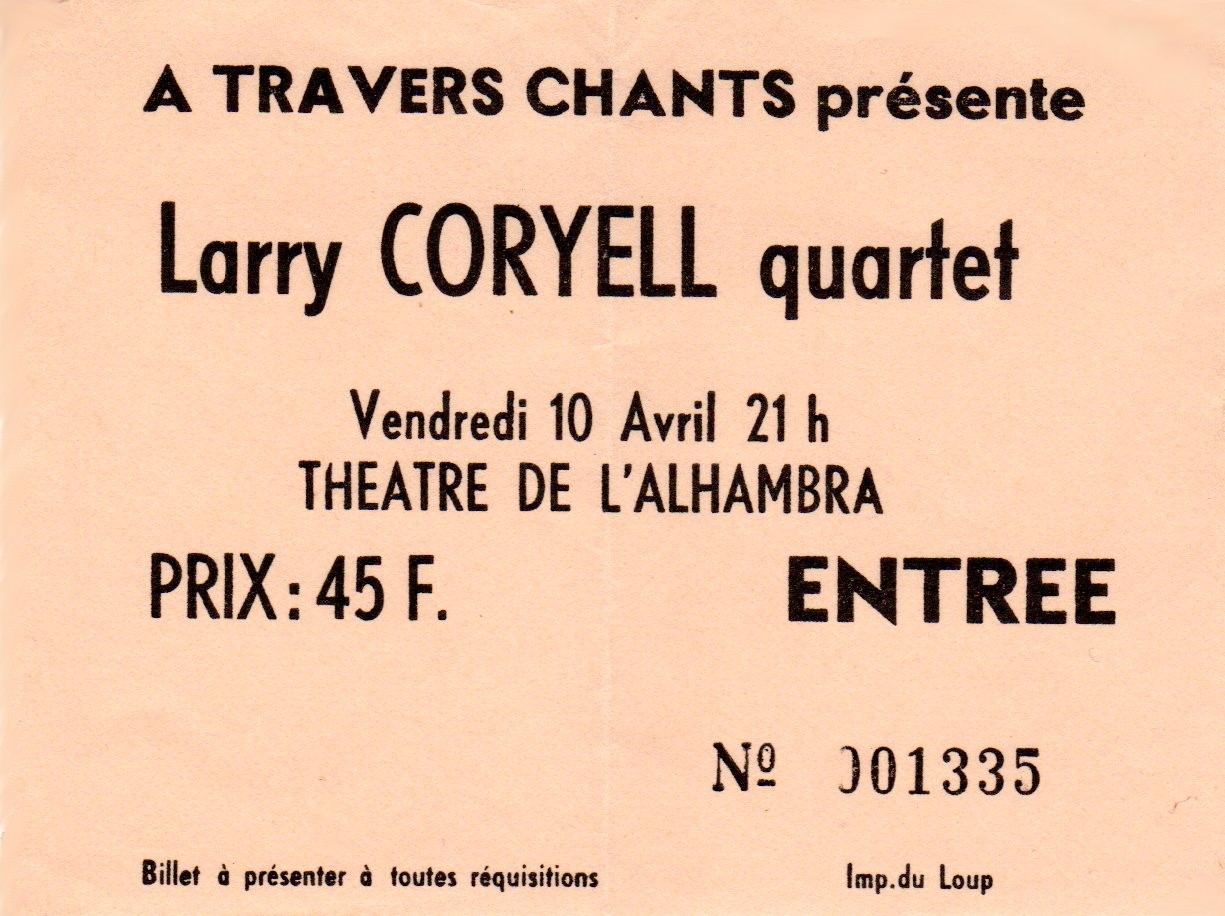 « J'aimais bien le côté touche-à-tout du grand guitariste Larry Coryell, alors revenu à une période acoustique, je l'avais même apprécié en chanteur dans l'album The Real Great Escape, mais sur le billet d'entrée pour ce concert, le libellé « Larry Coryell quartet » me paraissait un peu énigmatique. Finalement, pour dialoguer avec Larry il y eut un autre virtuose de la six cordes, Philip Catherine, et même, si ma mémoire ne me trompe pas, une troisième guitare, celle de l'impressionnant Paco de Lucía. Que du bonheur ! L’Alhambra, digne de la référence à Grenade suggérée par son nom, a toujours eu l'art de dégoupiller les surprises ! »