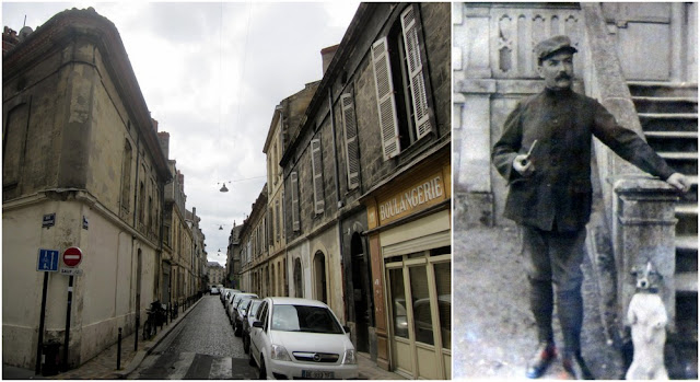 | Rue Bergeret et Raymond Boulesque. Avec son chien. (Photo de droite affichée dans la boutique de l'usine Jock.) |